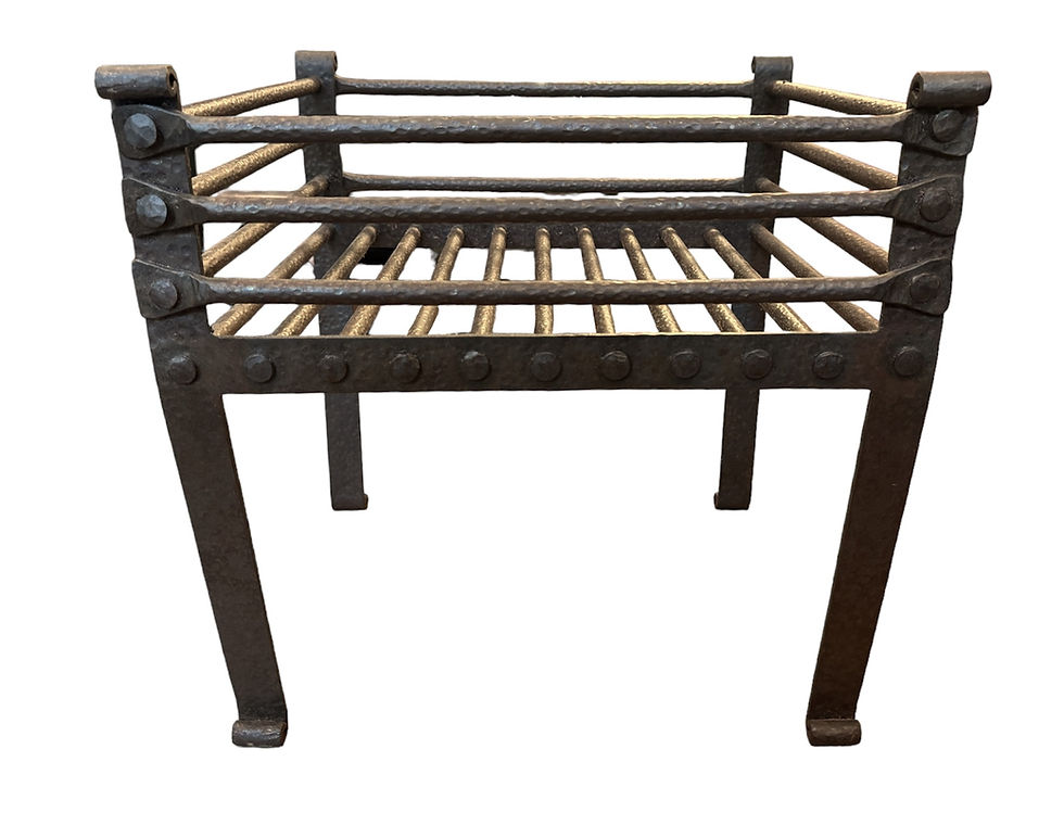 Charming, European-style, iron fireplace grate with a hammered texture. Hand-forged, this solid heavy-duty grate has tapered legs with soft scrolls, formed, and bent into shape by a blacksmith. The side rails look like old iron straps held by chunky Spanish Clavos (nail heads), more than structural railings. Its rustic, yet refined craftsmanship pulls you in, the more you look, the more there is to love and appreciate. Believed to date back to the late 1800s, it brings authentic, old-school elegance to your fireplace (or fire pit). Ideal and suitable for both indoor & outdoor fireplaces. It was most likely hand-made in Italy or France. Meticulous detailing and craftsmanship make it a rare find for collectors and enthusiasts of unique and one-of-a-kind pieces.